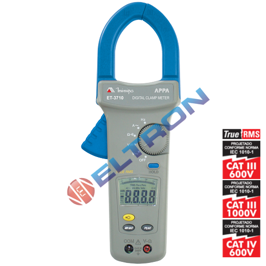 Carregando...Instrumento digital portátil, de acordo com a categoria IV 600V de segurança, True RMS AC, LCD de 3 3/4 dígitos com barra gráfica e iluminação de fundo, leituras de pico, máximo e mínimo, congelamento de leitura, abertura de garra de 51mm, desligamento automático e mudança de faixa automática. Realiza medidas de tensão DC e AC, corrente AC até 1000A, resistência e freqüência, e testes de diodo e continuidade.