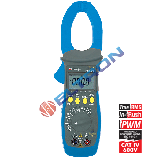 Carregando...Instrumento digital portátil com capacidade de medida de tensão e corrente em saída de inversores (PWM), função INRUSH e leitura True RMS, de acordo com a categoria III 1000V de segurança, LCD de 4 dígitos com barra gráfica e iluminação, congelamento de leitura e de pico, registro de máximo e mínimo, modo relativo, mudança de faixa automática e desligamento automático.