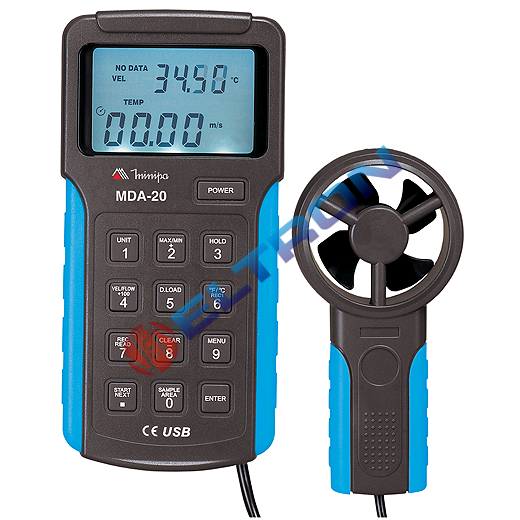 O MDA-20 pode ser usado para medidas de velocidade de deslocamento, volume e temperatura do ar.