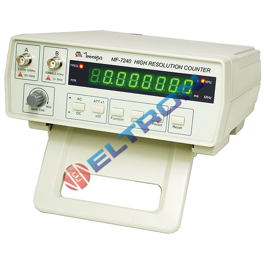 Instrumento digital de bancada com display LED de 8 dígitos, para medida de freqüência na faixa de 0,01Hz a 2,4GHz em dois canais.