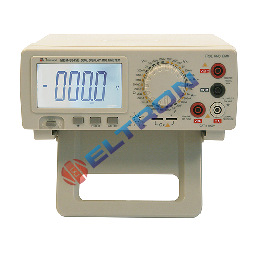 Carregando...Instrumento digital de bancada, com LCD de 4 1/2 dígitos com iluminação, medida True RMS e congelamento de leitura. Realiza medidas de tensão DC e AC, corrente DC e AC, resistência, capacitância e freqüência e testes de diodo, hFE de transistor e continuidade.