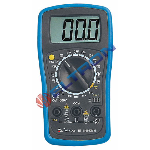 Realiza medidas de tensão DC e AC, corrente DC e resistência, e testes de diodo, continuidade e hFE.