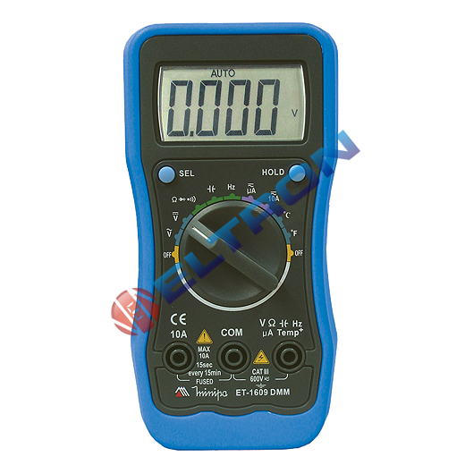 Instrumento digital portátil, de acordo com a categoria III 600V de segurança, LCD de 3 5/6 dígitos, congelamento da leitura, mudança de faixa automática, desligamento automático e holster protetor. Realiza medidas de tensão DC e AC, corrente DC e AC, resistência, freqüência, capacitância, temperatura e testes de diodo e continuidade.