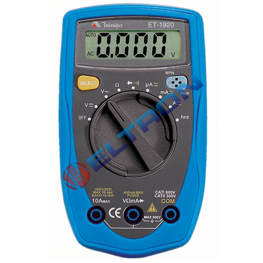 Carregando...Instrumento digital portátil, que se acomoda na palma da mão, categoria de segurança CAT II 300V, mudança de faixa automática, holster protetor e LCD de 3 3/4 dígitos. Realiza medidas de tensão DC e AC, correntes DC e AC, resistência, teste de Hfe, testes de diodo e continuidade.