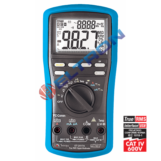 Carregando...Instrumento digital portátil, de acordo com a categoria IV 600V de segurança, com medida True RMS AC, detector de campo elétrico (EF) sem contato, desligamento automático, congelamento da leitura e pico, mudança de faixa automática, registro de máximo, mínimo e média, modo relativo, holster, interface USB opcional, advertência de conexão errada das pontas de prova e LCD de 4 dígitos (ACV, DCV, Hz) ou 3 5/6 dígitos (mV, μA, mA, A, Ohms, Capacitância) com barra gráfica.