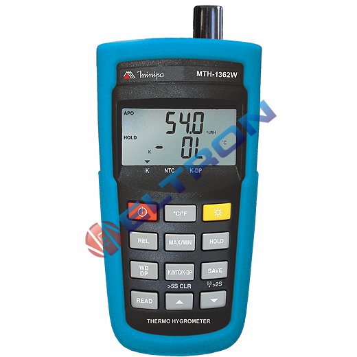 Carregando...Instrumento digital portátil, LCD duplo de 5 dígitos com iluminação, interface wireless (sem fio), memória para 256 dados, função bulbo úmido e ponto de orvalho, auto desligamento, congelamento de leitura, registro de máximo / mínimo e modo relativo. Realiza medida de temperatura de 0°C a 60°C ou 32°F a 140°F e umidade relativa de 0 a 100% RH, com resolução de 0,1°C / 0,2°F e 0,1% RH